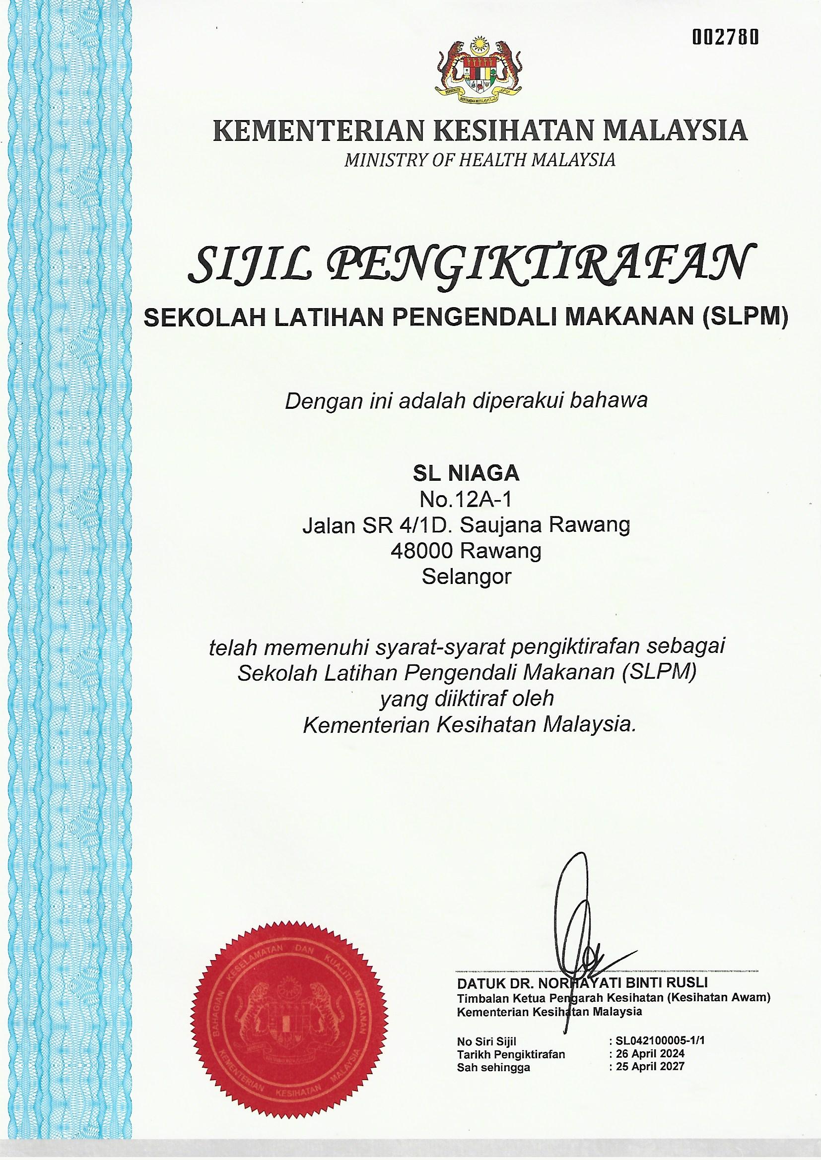 SL NIAGA TRAINING & CONSULTANCY merupakan Sekolah Latihan Pengendali Makanan (SLPM) yang diiktiraf oleh Kementerian Kesihatan Malaysia (No: SL042100005) untuk menjalankan Kursus Latihan Pengendali Makanan. Sijil kami juga diiktiraf oleh semua PBT seluruh Malaysia.
